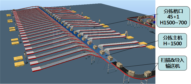 - 配置45个分拣格口及1个容错格口,分拣格口采用动态变址技术。分拣格口采用无动力增大缓存量(10箱以上)。